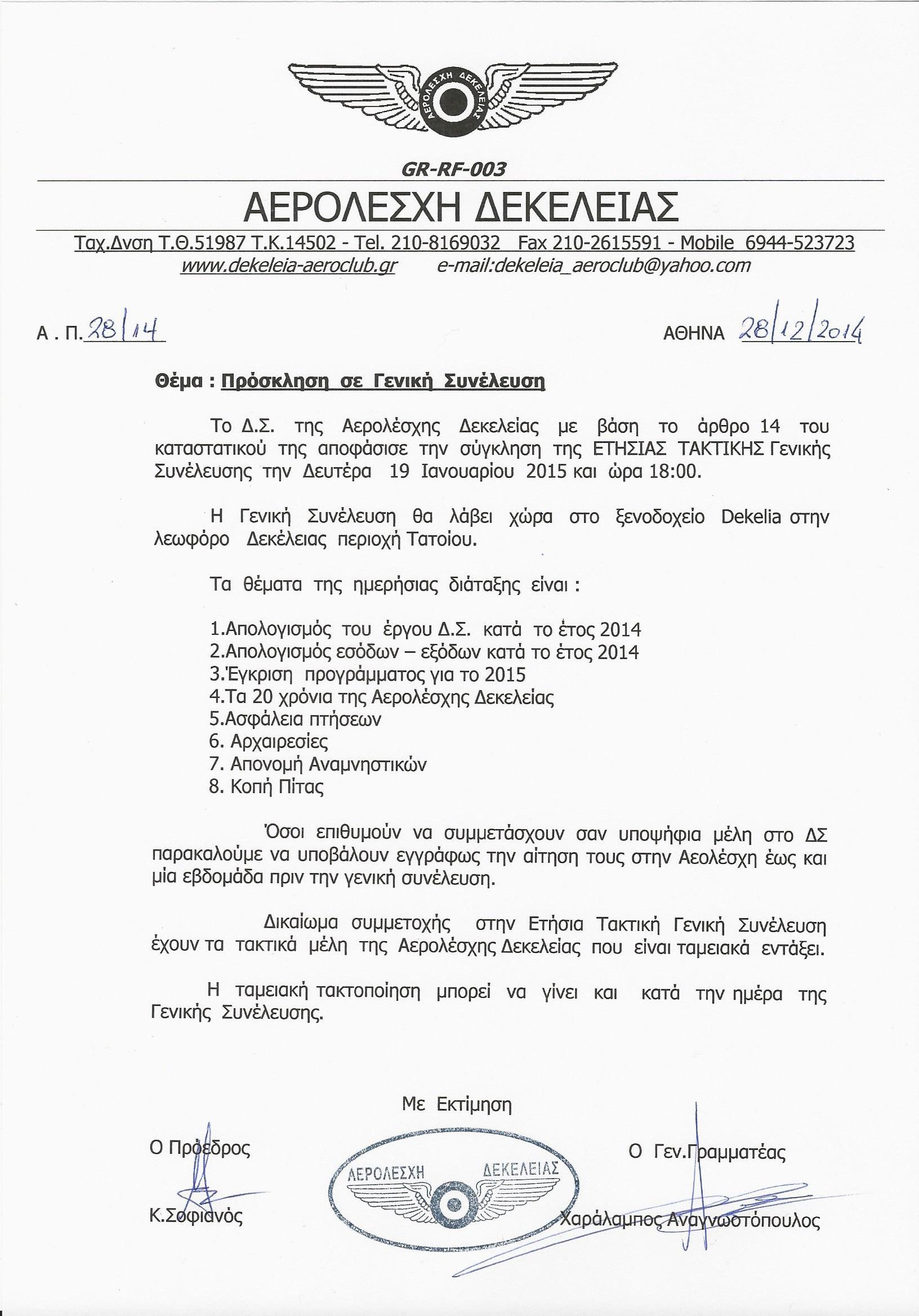 Την Δευτέρα 19/1/2015 θα πραγματοποιηθή η ετήσια γενική συνέλευση και η κοπή πίττας